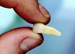 5. Houd vervolgens de tanden op elkaar met ertussen een papieren zakdoekje of een gaasje. Zo blijft de tand het beste op zijn plaats.