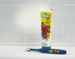 Vanaf het doorbreken van de eerste tandjes: eenmaal per dag poetsen met fluoride-peutertandpasta.
